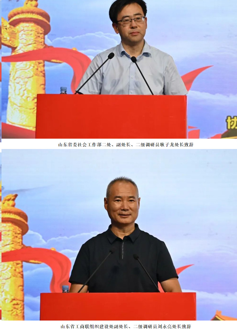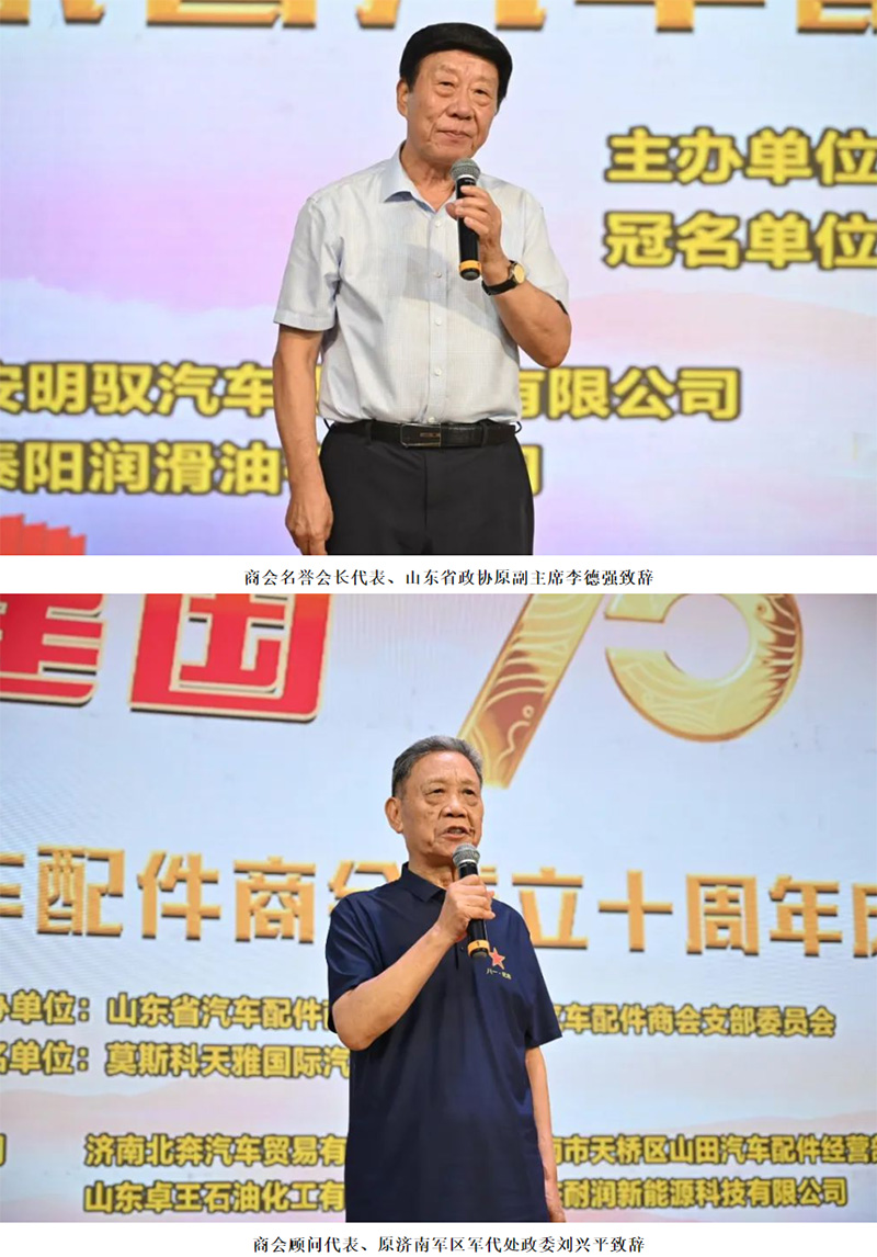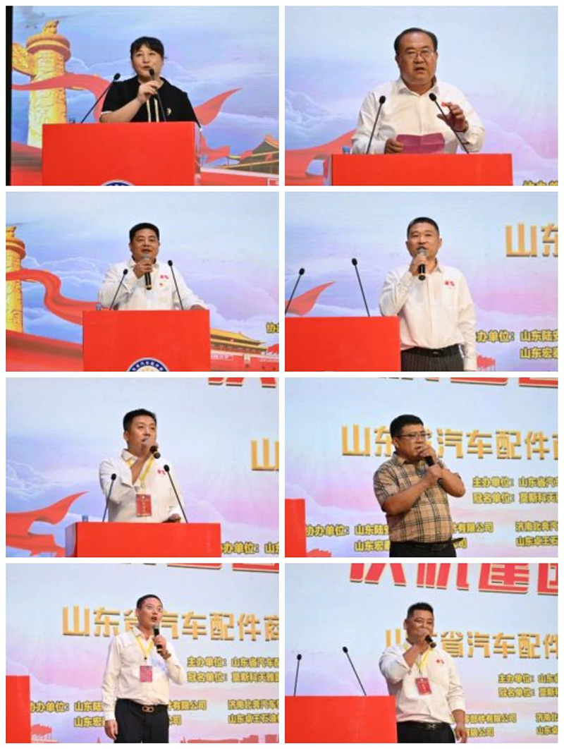 济南市天桥区委副书记、区长张庆国;山东省民政厅政策法规处、一级调研员李茂荣处长;山东省委社会工作部二处、副处长、二级调研员耿子龙处长;山东省工商联组织建设处副处长、二级调研员刘永亮处长分别上台致词,各位领导充分肯定了山东省汽车配件商会成立十年来所做的工作和成就,是与祖国共奋进、与时代同发展的十年。肯定了我商会为国家建设积极参加社会公益事业和参与国家双百扶贫求助活动,以及为山东省汽车配件行业健康发展做出的重要贡献。同时,也提出了更高的要求,呼吁山东省汽车配件商会以成立十周年为新的起点,深入学习贯彻落实习近平新时代中国特色社会主义思想,认真落实省委、省政府关于促进民营经济高质量发展的决策部署,进一步加强自身建设,提高服务能力、质量和水平,不断开创商会工作新局面。同时,也希望广大汽车配件企业能够抓住机遇,走出去,请进来,参与到“一带一路”,拓展海外市场,乘势而上,加大科技创新投入,加快转型升级步伐,不断提高产品质量和核心竞争力,努力在激烈的市场竞争中立于不败之地。要积极履行社会责任,树立良好的企业形象,为推动我省经济社会发展做出更大贡献。